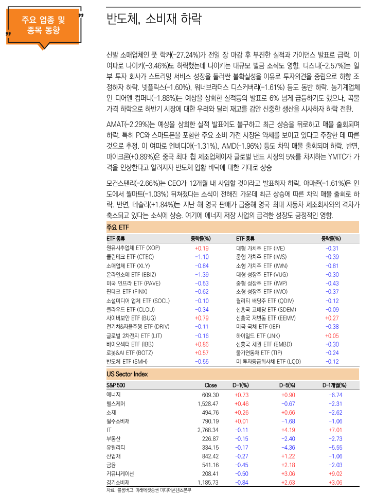 반면, 인텔(-5.52%)은 신제품 출시가 경쟁 심화에도 불구하고 느리게 전개되고 있다는 점이 부각되자 급락. 클라우드 관련 업체인 스노우플레이크(-16.50%)는 부진한 실적 발표와 연간 가이던스 하향 조정으로 급락. 소매업체 아메리칸 이글 아웃피터스(-11.93%)는 2분기 매출이 전년 대비 한자릿수 수준으로 하락할 것이라고 발표하자 급락. 달러트리(-12.03%)도 부진한 실적과 가이던스 하향 조정 후 급락. 타겟(-1.64), 달러제너럴(-2.51%)도 동반 하락. 의료기기업체인 메드트로닉(-4.51%)는 견조한 실적 발표에도 예상보다 부진한 가이던스 발표로 하락