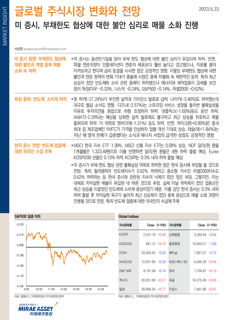 미 증시는 나스닥이 엔비디아가 급등하며 AI 관련 종목 중심으로 강세를 보였으나, 여타 종목 대부분은 하락한 점은 한국 증시에 부담. 특히 부채한도 협상 관련 바이든 미 대통령 등의 긍정적인 발언에도 불구하고 지연되고 있는 협상이 결국 디폴트 우려를 자극한 점은 투자심리 위축 요인으로 작용할 수 있기 때문