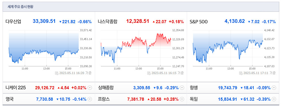 뉴욕증시는 11일(현지시간) 혼조 마감했다. 뉴욕증권거래소(NYSE)에서 다우지수는 전 거래일 대비 221.82포인트(0.66%) 하락한 3만3... 한국경제TV | 2023-05-12 06:48