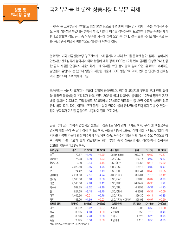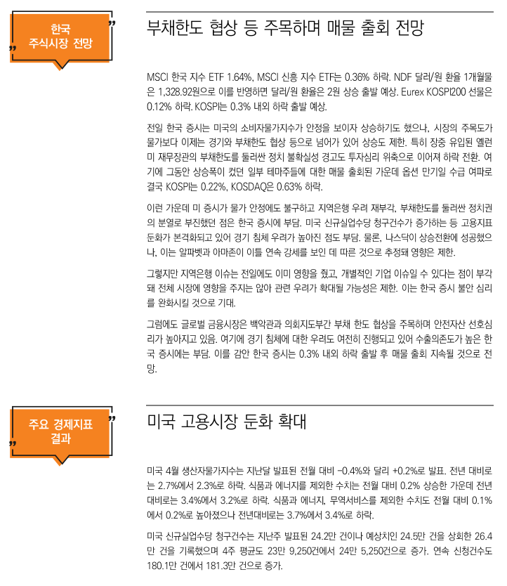 그럼에도 글로벌 금융시장은 백악관과 의회지도부간 부채 한도 협상을 주목하며 안전자산 선호심리가 높아지고 있음. 여기에 경기 침체에 대한 우려도 여전히 진행되고 있어 수출의존도가 높은 한국 증시에는 부담. 이를 감안 한국 증시는 0.3% 내외 하락 출발 후 매물 출회 지속될 것으로 전망.