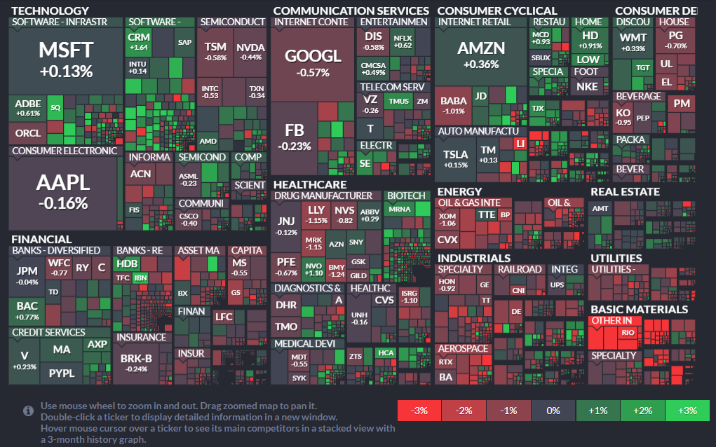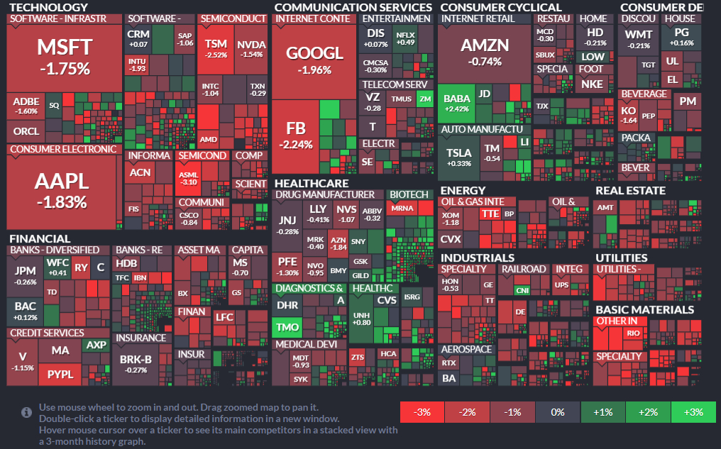 아침 보합세로 시작한 증시는 코로나 변이확산우려와 Fomc를 앞둔 차익실현 매도세가 강화되며 전반적인 약세를 하루종일 보여주며 하락마감하였습니다. 상대적으로 잘 버텨온 빅테크 중심의 나스닥이 하락폭이 컸습니다.