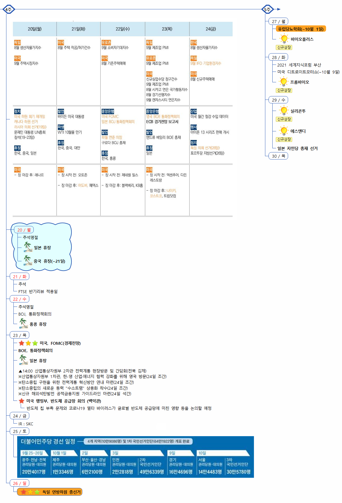 - 미 FOMC 테이퍼링 플랜 발표(21~22일), 테이퍼링 속도에 대한 정책 방안과 점도표에서 2022년 금리인상 가능성이 제시될 가능성 여부가 포인트.