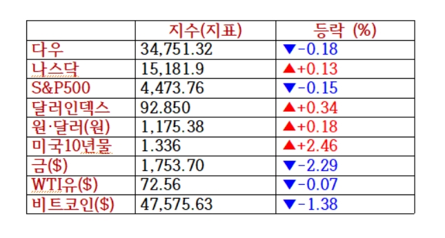 - 뉴욕증시 3대지수 모두 하락. 테이퍼링에 대한 경계감과 델타 변이 바이러스가 경제적 손실을 일으킬 수 있다는 전망에 불확실성 확대.