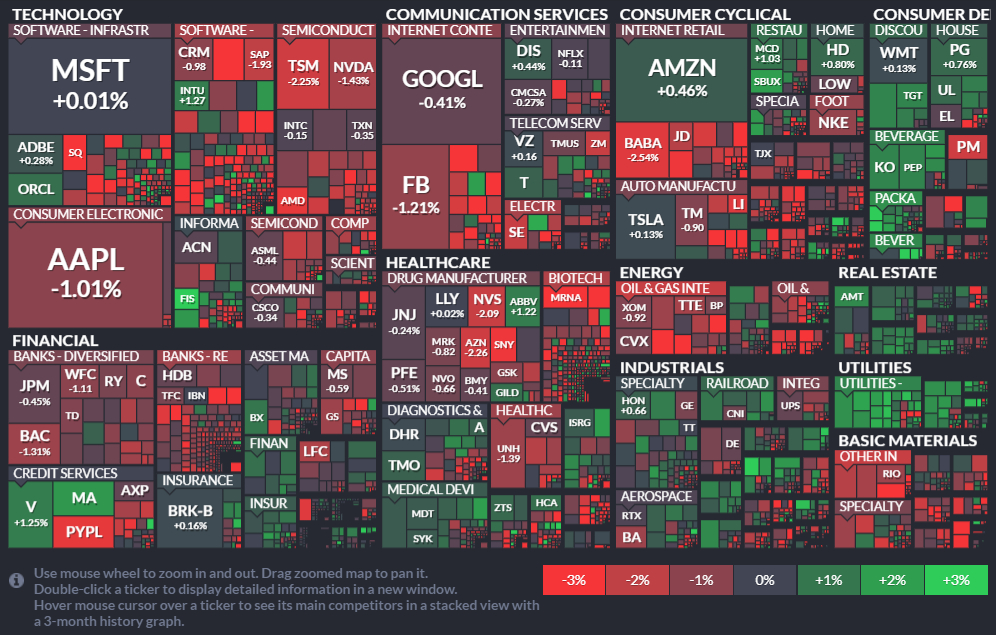 주요 기술주인 팡(FAANG) 종목은 아마존 제외 모두 하락했다. 아마존은 이날 강보합(0.46%) 마감했다. 애플과 페이스북은 각각 1.01%, 1.21% 하락했다. 넷플릭스와 구글은 각각 0.11%, 0.41% 하락하며 약보합권에서 거래를 마쳤다. 구글의 모기업 알파벳도 0.44% 내렸다.
