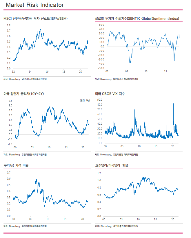 미국 증시는 경제 회복 둔화 우려에 하락 마감. 금일 발표된 미 연준(Fed) 베이지북에서는 미국 경제의 인플레이션 압력이 높아지고 있으며, 델타 변이 확산으로 회복세는 완만한 속도로 둔화된 것으로 평가. 이는 최근 부진한 고용지표와 주요 투자은행인 모건스탠리, 씨티그룹이 미국 주식에 대한 투자 의견 조정과 맞물려 시장의 위험자산 회피심리가 증대되었으며, 증시 하방 압력으로 작용. 금일 뉴욕증시는 장 초반 베이지북 발표를 주시하며 혼조세를 보였으나 장 중반 이후 다우지수가 하락 전환해 3대 지수 모두 내림세로 마감하였으며, 경제 둔화 우려에도 대형 기술주로 자금이 유입되며 고점 랠리를 이어온 나스닥은 금일 알파벳(GOOGL/-0.4%), 애플(AAPL/-1.0%) 등 메가캡 기업의 주가가 내림세를 기록하며 지수는 0.6% 하락 마감. 한편, 금일 제임스 불러드 세인트루이스 연은 총재와 존 윌리엄스 뉴욕 연은 총재는 경제가 개선된다면 올해 안에 테이퍼링을 시행하는 것은 적절하다고 평가. 다만 테이퍼링이 기준 금리 인상과 연결되는 것은 아니라며 선을 그으며 시장에 안도감을 제공.