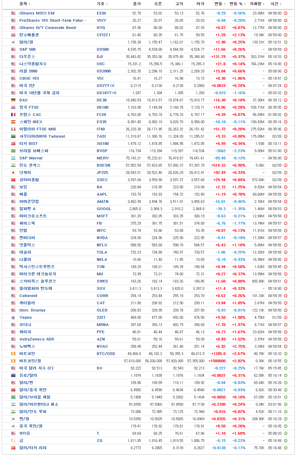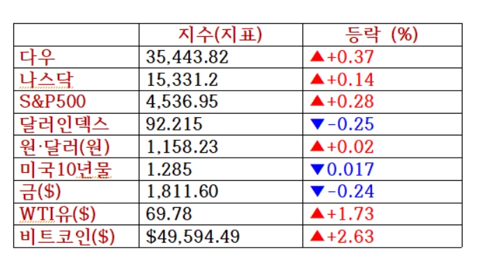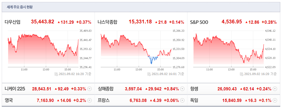 현지 시각으로 2일 뉴욕증권거래소(NYSE)의 다우존스산업평균지수는 전날보다 131.29포인트(0.37%) 상승한 3만5,443.82에 거래를 마쳤다. 스탠더드앤드푸어스(S&P)500은 12.85포인트(0.28%) 오른 4,536.94, 나스닥은 21.80포인트(0.14%) 뛴 1만5,331.18에 마감했다. S&P500과 나스닥은 신고가를 기록했다.