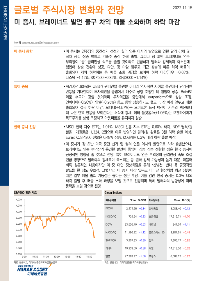 미 증시는 민주당의 중간선거 선전과 월러 연준 이사의 발언으로 인한 달러 강세 및 국채 금리 상승 여파로 기술주 중심 하락 출발. 그러나 장 초반 브레이너드 연준 부의장이 ‘곧’ 금리인상 속도를 줄일 것이라고 언급하자 달러화 강세폭이 축소된데 힘입어 상승 전환에 성공. 다만, 장 마감 앞두고 최근 상승에 따른 차익 매물이 출회되며 제차 하락하는 등 매물 소화 과정을 보이며 하락 마감(다우 -0.63%, 나스닥 -1.12%, S&P500 -0.89%, 러셀2000 -1.14%)